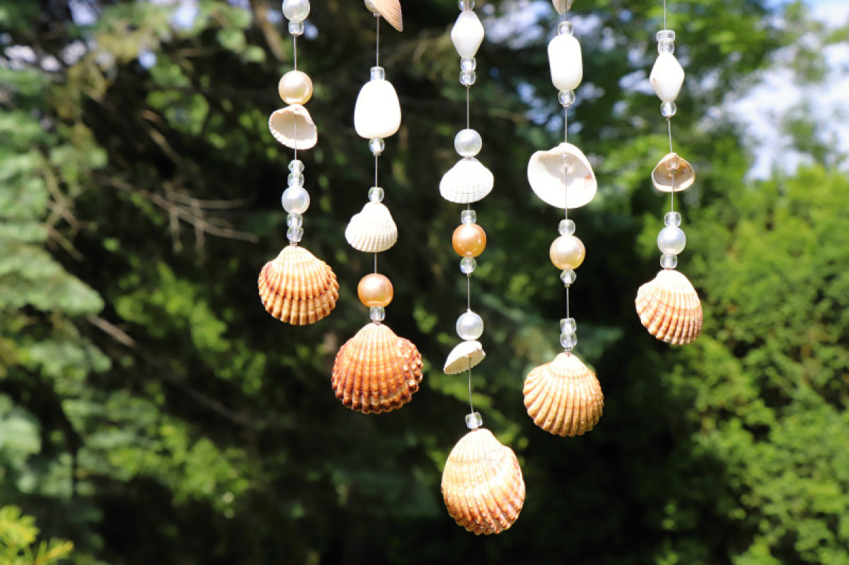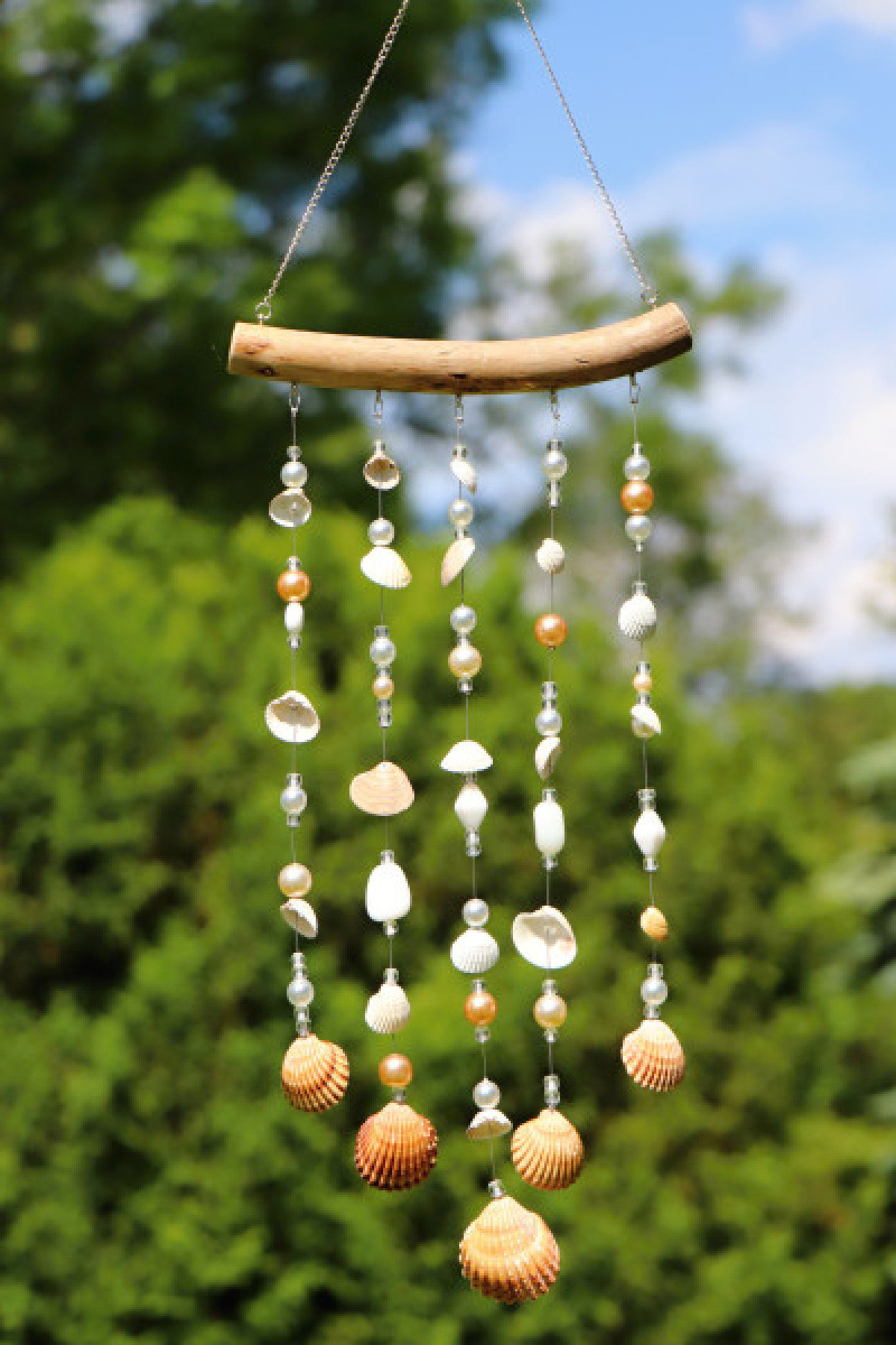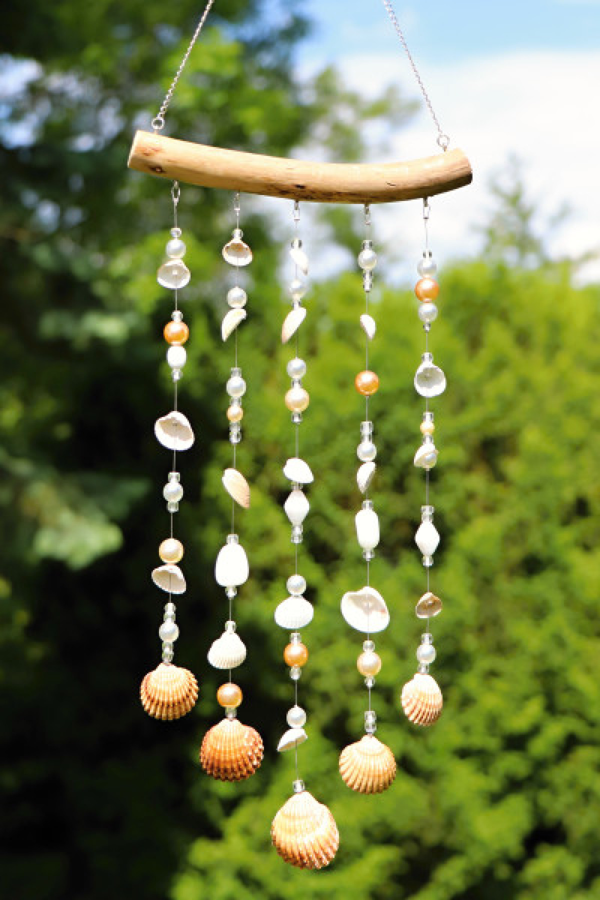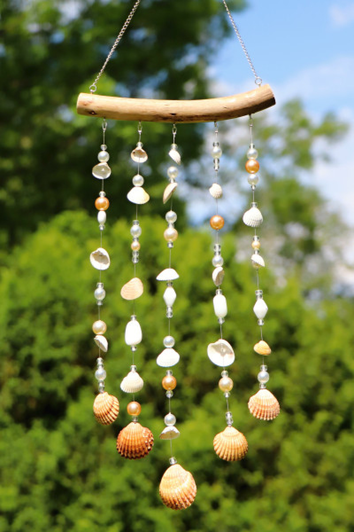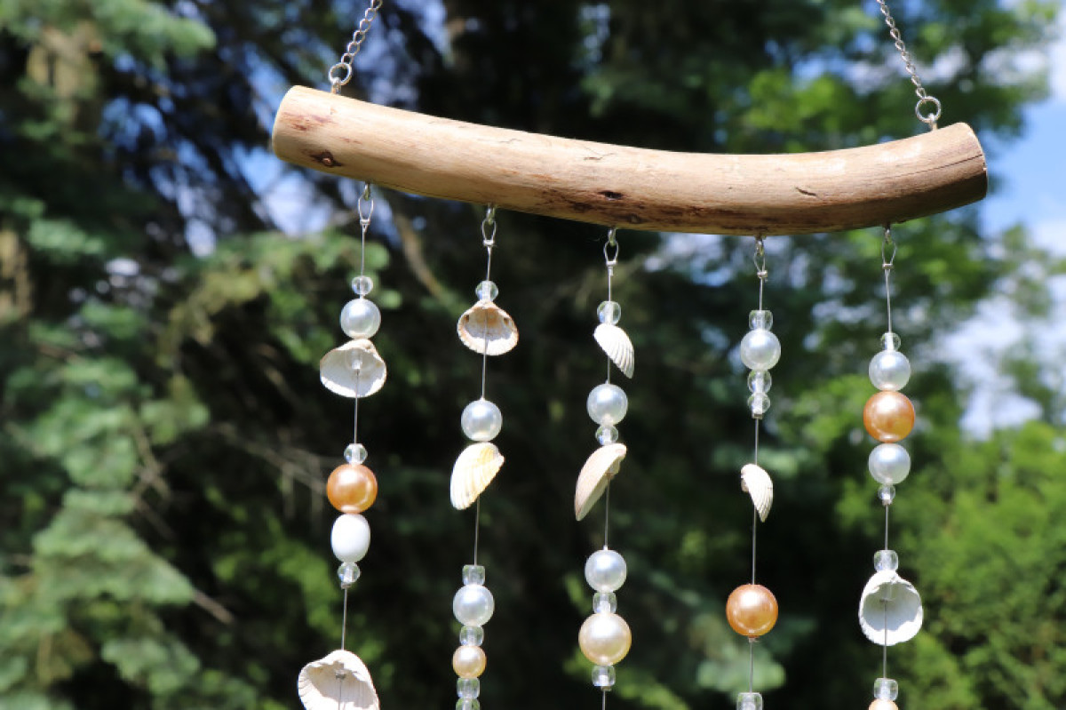 Závěsná dekorace s mušlemi a různými korálky je zavěšená na přírodním dřevě a celá na řetízku. Jedná se o závěsnou dekoraci, která nejlépe vynikne ve volném prostoru.