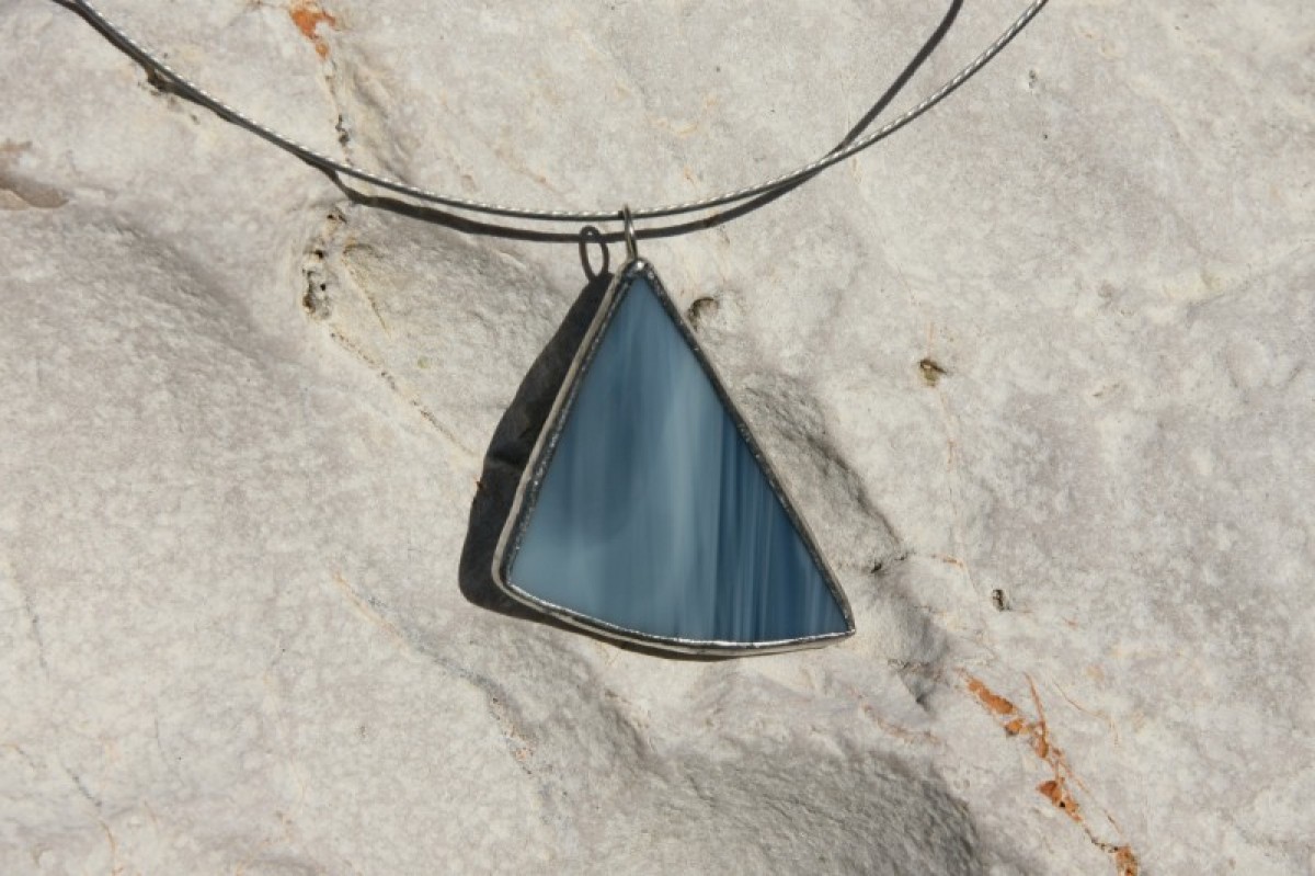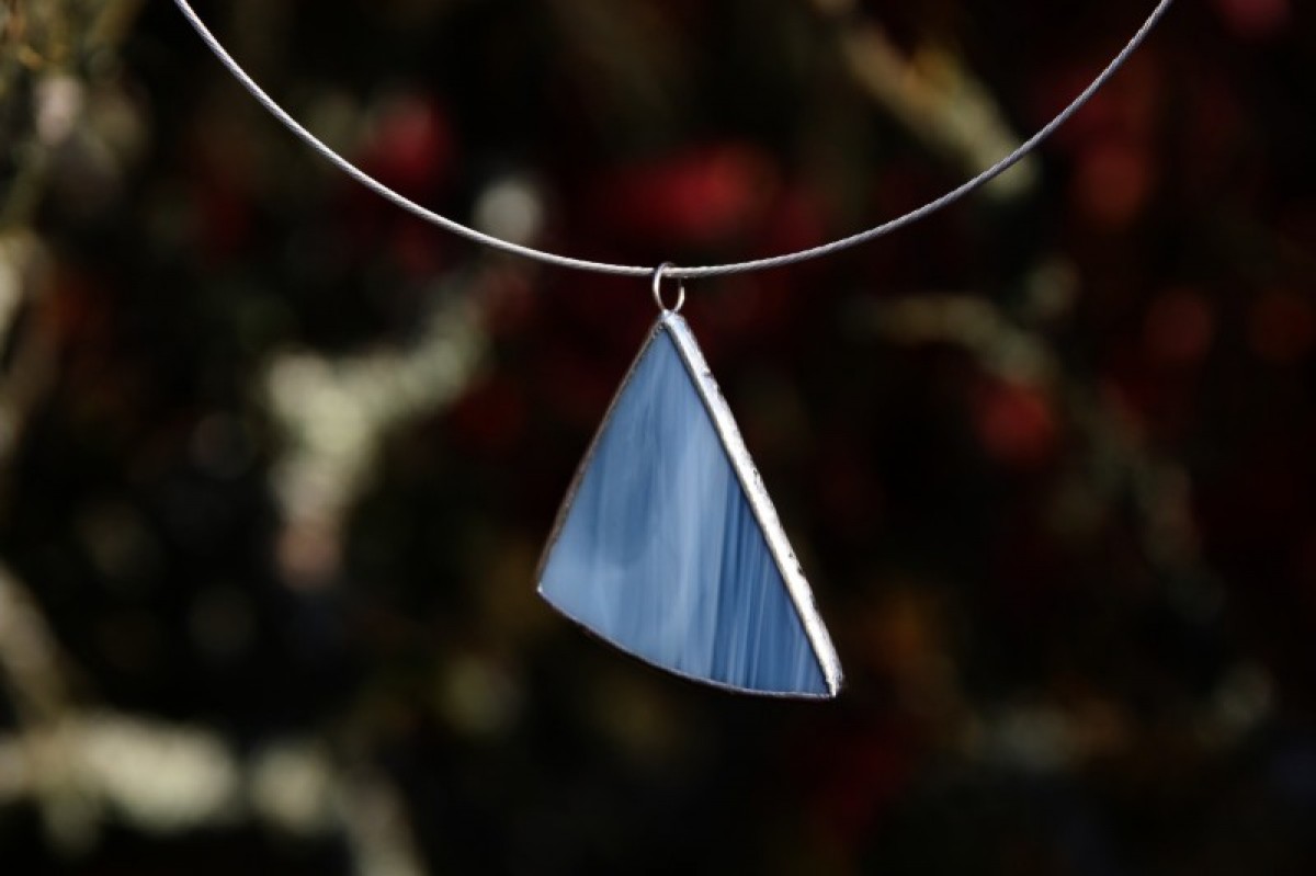 Náhrdelník je zhotoven tiffany technikou z opálového tmavomodrého skla. Sklo je obroušeno, ocínováno a nakonec je celý šperk opatřen antioxidačním nátěrem.